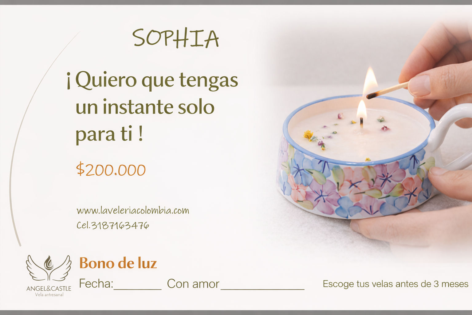 Con esta tarjeta, la persona podrá elegir entre nuestras velas artesanales aromáticas y velas de masaje, todas presentadas en cerámica hecha a mano. Es un regalo práctico, elegante y profundamente significativo, perfecto para cumpleaños, agradecimientos, celebraciones o simplemente para decir “te mereces un momento para ti”.