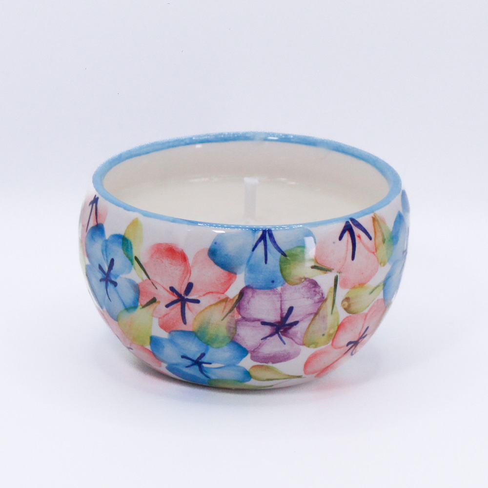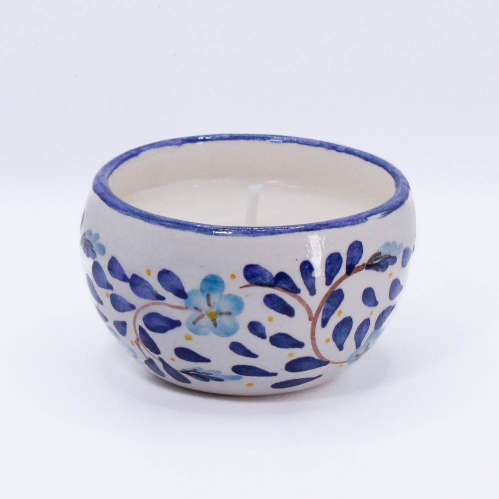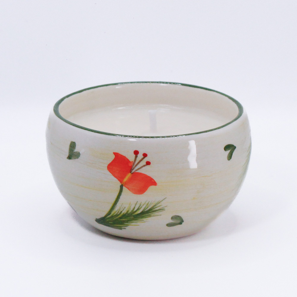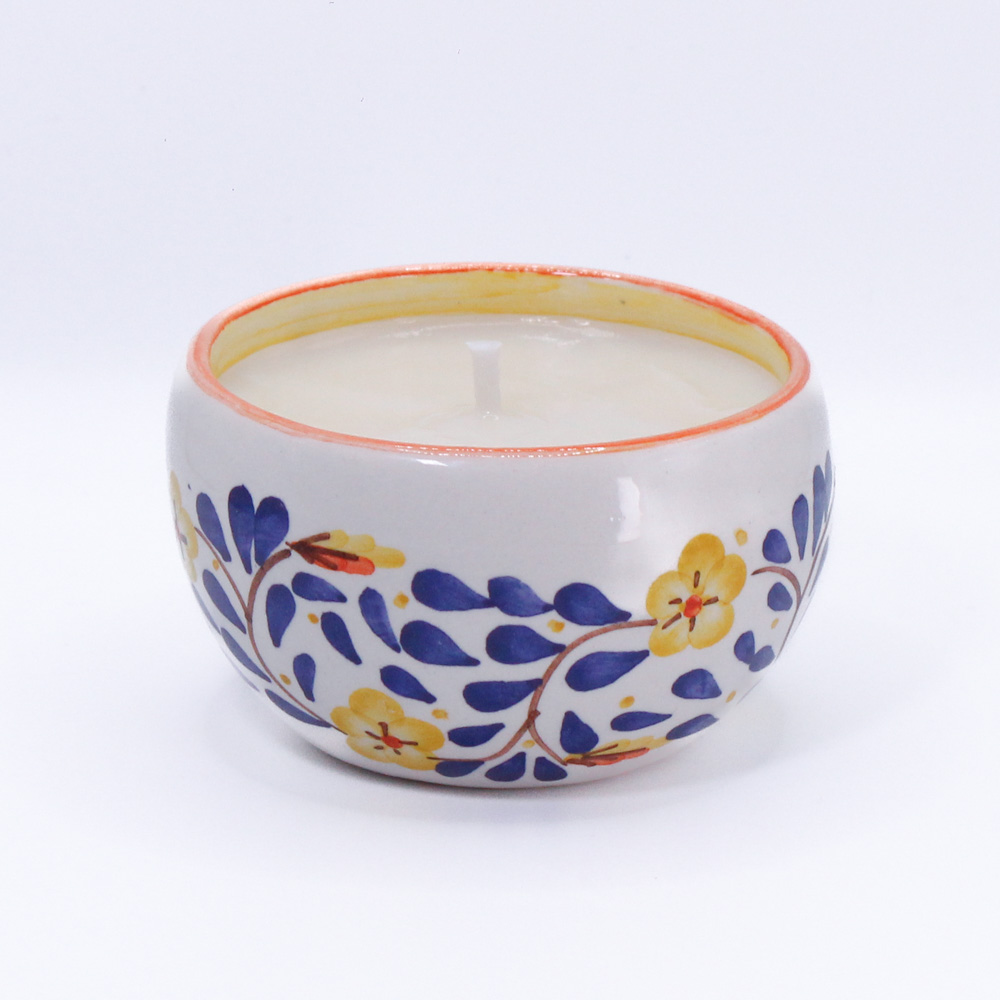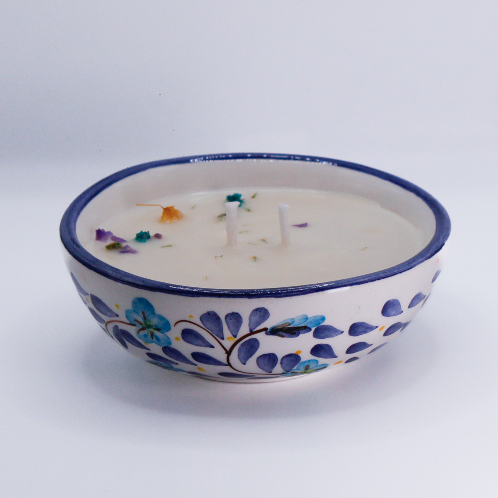 Su vasija de cerámica fina hecha y pintada a mano por artesanos de Carmen de Viboral-Colombia, la hace una pieza única. Cuando la vela se termine, puedes hacer uso de la vasija como complemento de tu vajilla.