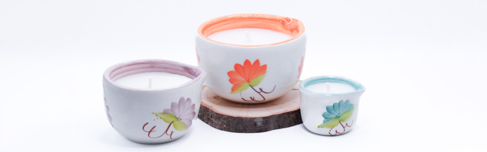 Vela contenida en vasija de cerámica fina decorada a mano en Carmen
